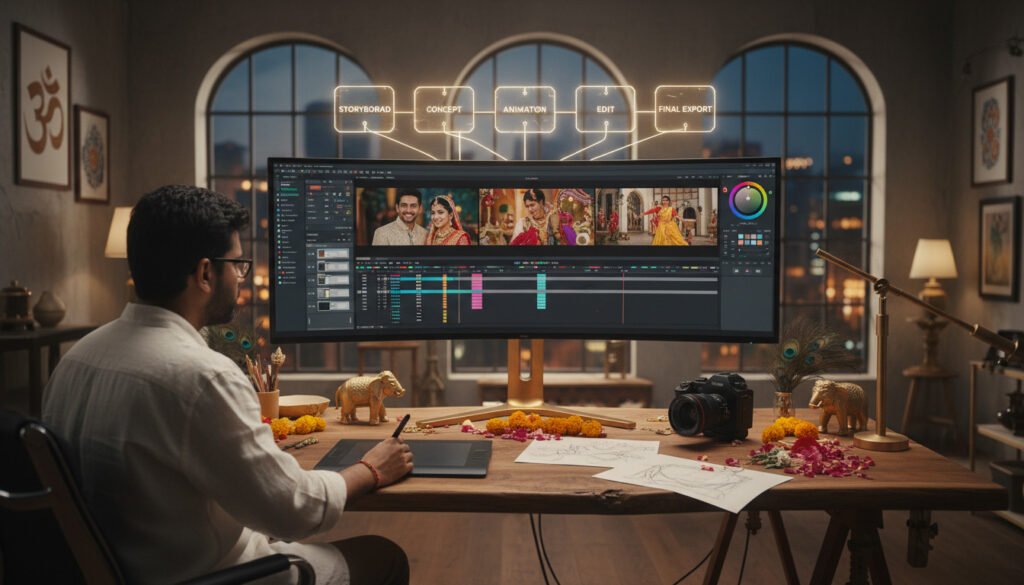 It all starts with a conversation. We dive deep into your story, theme (e.g., royal Rajput, rustic Punjabi, minimalist South Indian), and must-have elements. We help you decide on the video’s length (typically 60-90 seconds is ideal), narrative flow, and key information points.