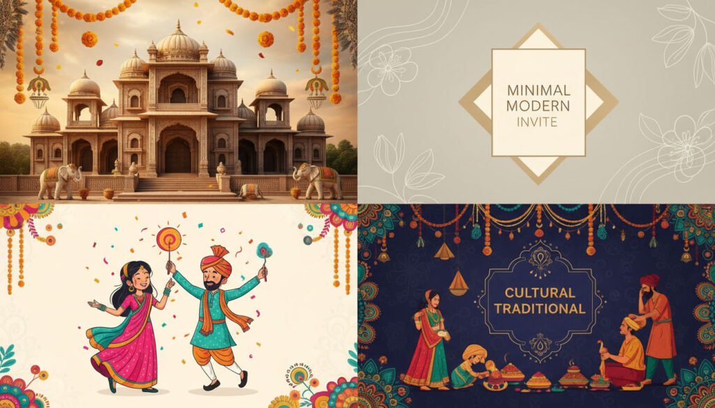 - The Royal Opulent: Rich gold textures, slow-motion shots, classical music, and motifs inspired by Mughal or Rajput art.